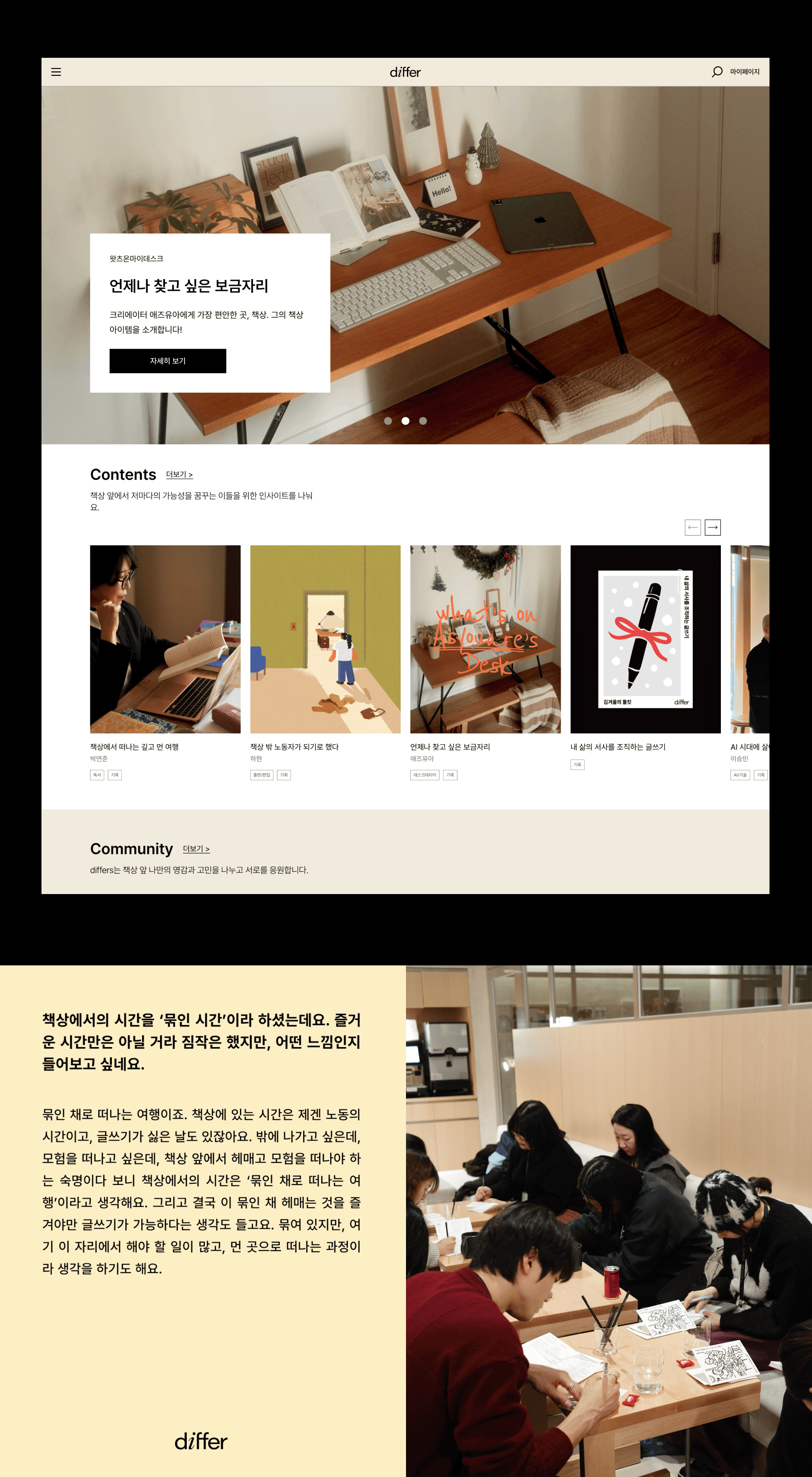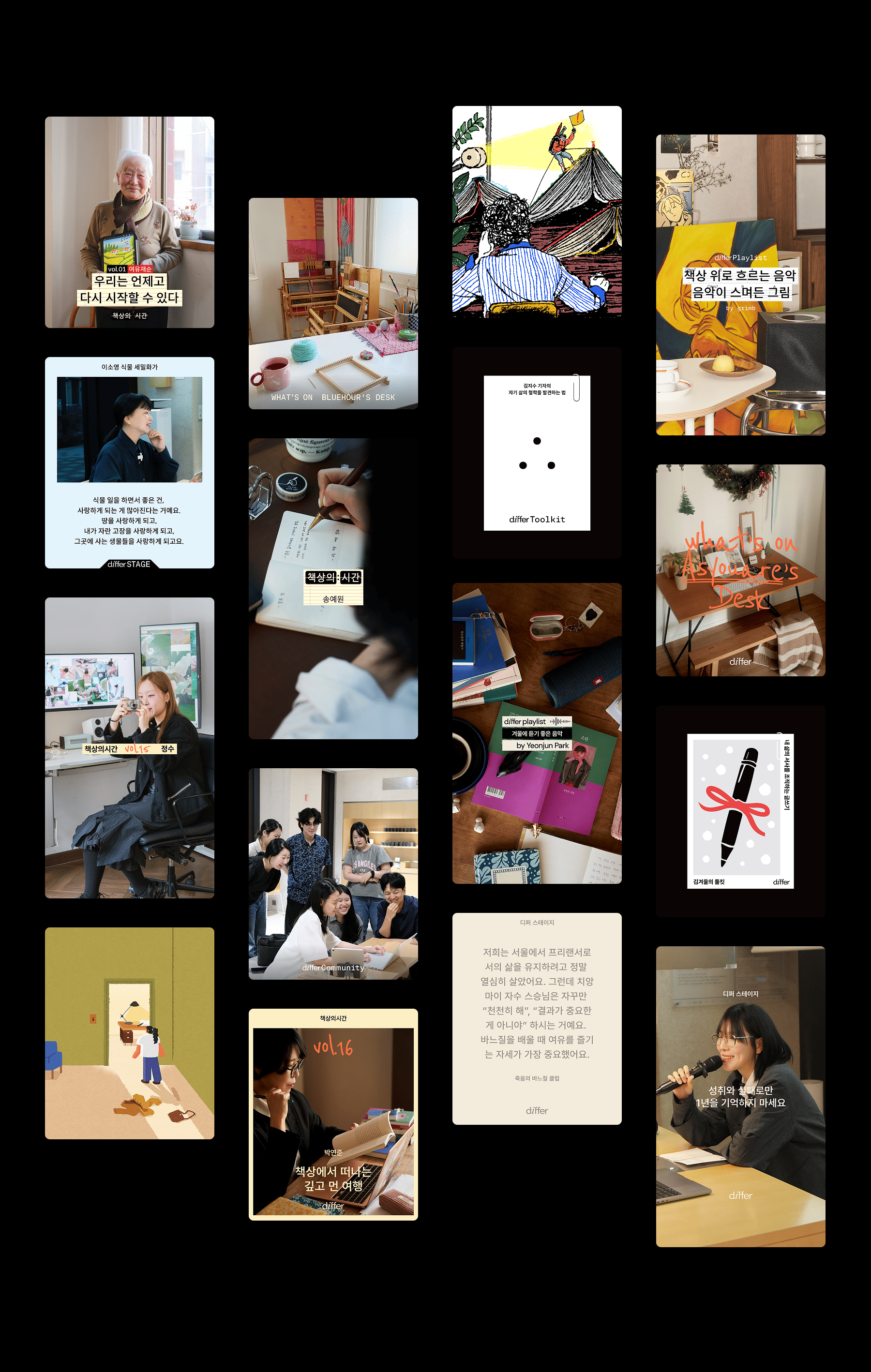 differ는 워크 앤 라이프스타일 브랜드 ‘DESKER (데스커)’에서 2022년부터 진심을 담아 만드는 커뮤니티이자 미디어로, 브랜드의 철학을 분명히 전하고 독자와의 관계를 긴밀하게 구축하기 위해 디퍼의 방향성 및 전략을 새로이 구축하고 2025년 3월부터 연간 운영을 시작했다.